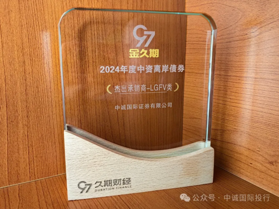 2025年3月27日,由久期财经主办的“金久期”2025年度中资离岸债券高峰论坛在深圳成功举办。久期财经长期跟踪中资离岸债券市场,在经历了长达3个月的严格筛选后,从中评选出了一批杰出的市场参与人。本次评选专家委员会根据企业过往业绩成长、行业排名、公司治理、商业模式、市场影响力及资本市场表现等因子进行评分,遴选出最终获奖名单。中诚国际证券凭借2024年中资离岸债券市场中杰出表现获得“金久期”2024年「中资离岸债杰出承销商-LGFV类」奖项,该奖项印证了我司在该领域的发展和成绩,获得了市场及客户的高度认可和评价。